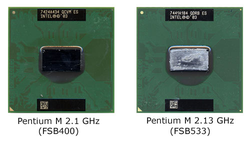 Voici par exemple un Pentium M 765 (2.1 GHz) sur bus FSB400 et un Pentium M 770 (2.13 GHz) sur bus FSB533. Extérieurement, les deux processeurs sont donc semblables, côté pile comme côté face. Le Dothan FSB533 est-il un simple Dothan avec un bus modifié ? Il semble qu'Intel ait tout de même revu quelque peu son processeur : Un changement de stepping est en effet intervenu :