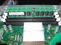 En voit bien ici le XMB qui se trouve sous le radiateur ainsi que les slots de mémoires. Le XMB est un composant FC-BGA3 de 829 contacts. Il sert d'interface entre la mémoire et les contrôleurs IMI du Northbridge :