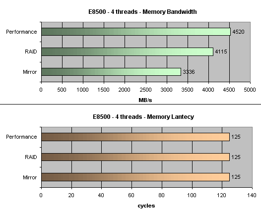 L'architecture peut donc être considérée comme du Quad Channel Dual DDR2-400. A noter que chaque XMB dispose d'une bande passante de 2.67 GB/s en écriture et de 5.33 GB/s en lecture, soit un total de 10.6 GB/s en ecriture et 21 GB/s en lecture. Bien entendu, les XMB et l'E8500 disposent également de fonctionnalités de tolérance de pannes avancées et inédites. Les différents XMB peuvent ainsi fonctionner en mode RAID 1 (Mirroring), ou RAID 5 !! Voici un petit récapitulatif :