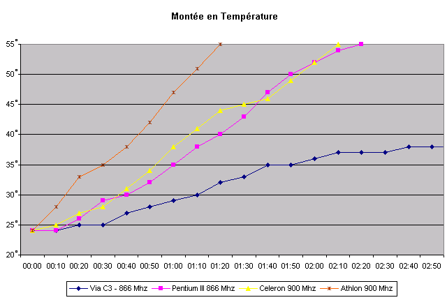 Bref, alors que l'Athlon arrive à 55 °C en 1 minute 20, le C3 est toujours a 38 °C aprés 3 minutes. Cette temperature reste constante aprés 1 heures d'utilisation. On peut donc sans probleme se passer de ventilateur ! Le C3 a donc une carte intéressante à jouer dans le domaine des portables et des périphériques mobiles ( PDA et autres). Voyons maintenant s'il remplit son rôle dans un PC de bureau.