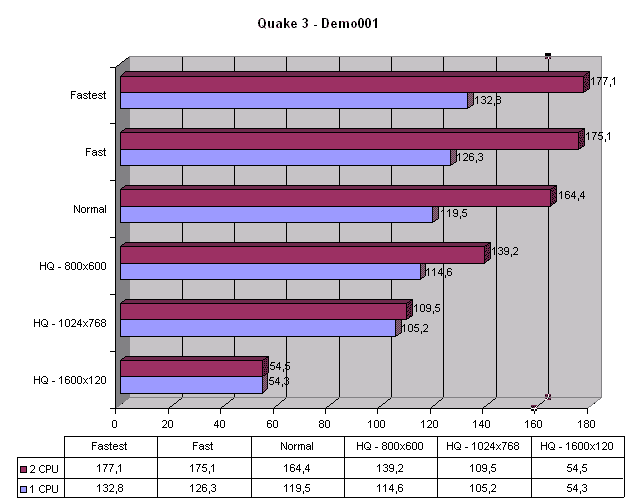 Le gain concernant le framerate peut atteindre 50% de rapidité supplementaire en basse résolution ( 640x480 ). En mode Haute-Qaulité 1024x768, le différence devient quasiment nulle, limitée par la carte graphique. En 1600x1200 HQ, un ou deux processeurs obtiennent les memes résultats.