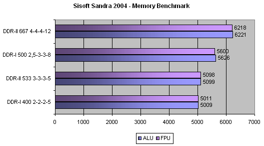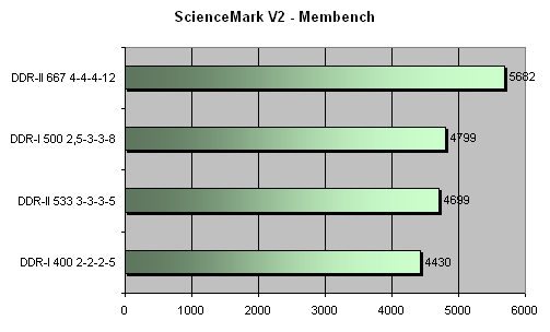 Comme on le voit ici, le mode DDR-I 500 surpasse sans aucun problème le mode DDR-II 533, mais la tête du classement revient sans conteste à la DDR-II 667. On constate également qu'avec des timings faibles, la DDR-II 533 reprends l'avantage sur la DDR-I 400 alors que ce n'était pas le cas avec des timings plus élevés. Les résultats du test membench de ScienceMark v2 confirment ces résultats :