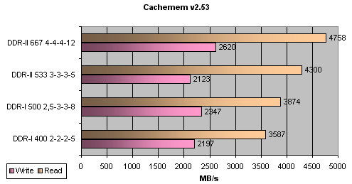 C'est sans conteste la DDR-I qui offre un meilleur temps de réponse. On constate également un autre fait : Si la bande passante obtenue par la DDR-I 500 ne permet pas de compenser les timings plus élevés, c'est le cas de la DDR-II puisque le mode désynchronisé en 4-4-4-12 offre une latence plus basse que le mode DDR-II 533 et FSB800 en 3-3-3-5. Enchaînons maintenant avec cachemem :