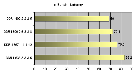 Au vue des résultats, il semble clair que la DDR-II profite bien plus qu'un haut FSB que la DDR-I. Ainsi, plus la fréquence de la mémoire augmente et plus le FSB monte, plus les performances sont élevées avec une progression qui n'est pas linéaire. On peut ainsi penser que le débit obtenus permet de compenser de plus en plus les timings élevés de la mémoire. Au sujet de ces timings voyons les résultats sous mbench :